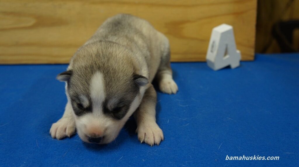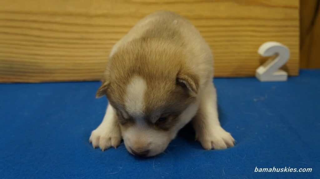Bella’s puppies are doing great and growing into big fat puppies. Here are the 2 week old Husky puppy pictures. They have official numbers now. Female 1 Female 2 Male 1 Male 2 Male 3