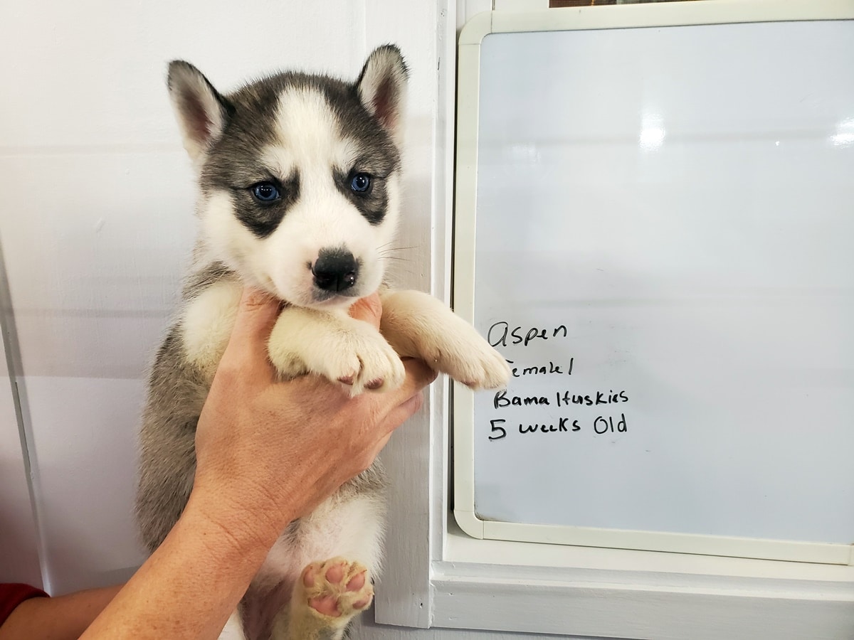 Aspen’s puppies are sweet little pups. They will run out of the nursery into the play yard and wait for me to pick them up and put them in the play ring so they can eat. Very smart puppies already. These pups can start going home 11-29 thru12-13 Please make an appointment to pick up your puppy. Also they are on Nuvet vitamins that you can see more about them here https://bamahuskies.com/blog/nuvet-vitamins
