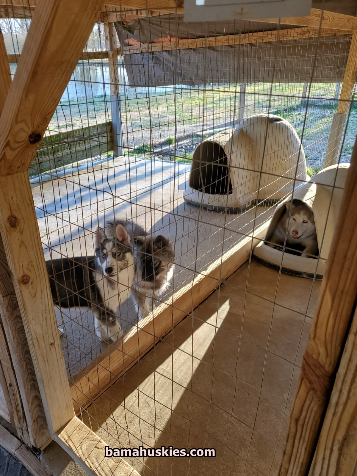 Next big change came for Phoenix and Yeti. These puppies have been living in the puppy kennels indoor for all their life except for play time each day out on the large play yard mostly away from the pack. They have now moved to an outside puppy kennel that is large. They will have lots of room to run around and get use to seeing all the adult huskies. They will be closest to the males right now. Later they will move over to the main kennels once they are older.