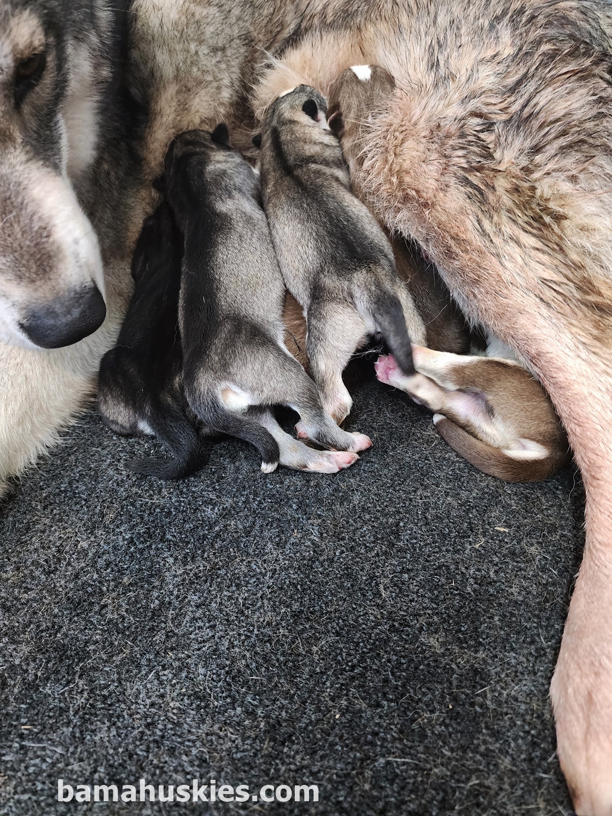 Our sweet husky Everest has a new litter of puppies. Born on 4-5-23. She has 5 boys and 2 girls. We have Agouti, cooper, and grey and white puppies born in this litter. They have been moved to our puppy nursery and mom and pups are all doing good. If your interested in a husky puppy for sale just contact us for availability. We will be happy to discuss what your looking for and a timeline to get it. We will need some info from you about dog owner experience, and we will need to know if you have a suitable space for a dog.