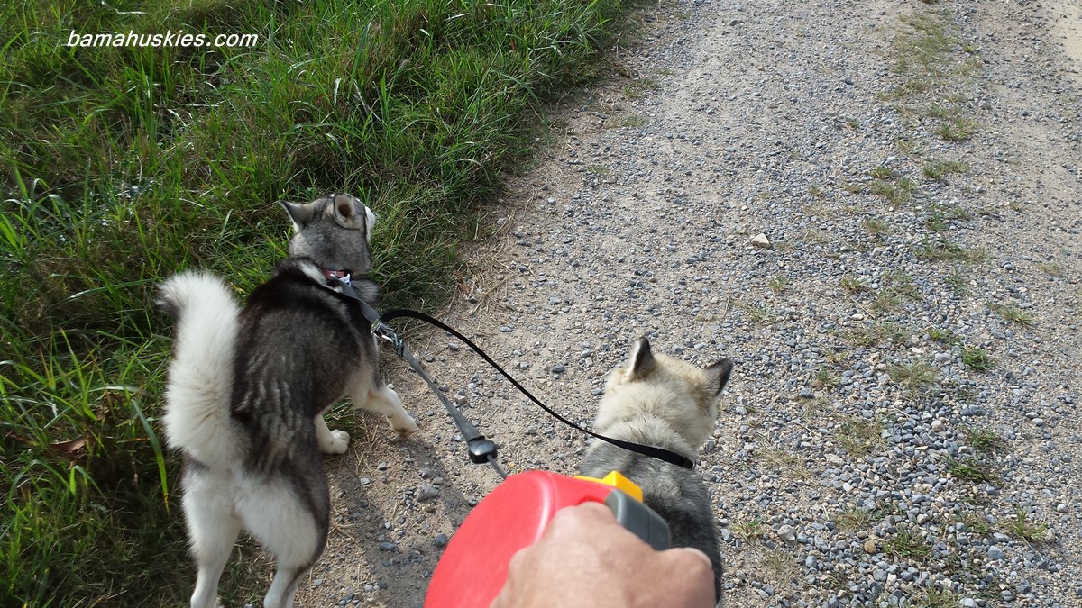 Hi everyone! It’s been a busy week around here at the husky kennels. We are getting ready for a couple of puppy litters that are coming soon. That means extra work for me but the rest of the pack could care less as long as they get to stay on schedule with food, play time, and walks. We started the day out this morning with Rylee and Lexi going together on a walk. It was their first time to be attached together but surprisingly they did just fine. I think they are ready to be my lead dogs pulling a cart. Well maybe not just yet but they did do good. Here is a pic of them on their walk this morning.