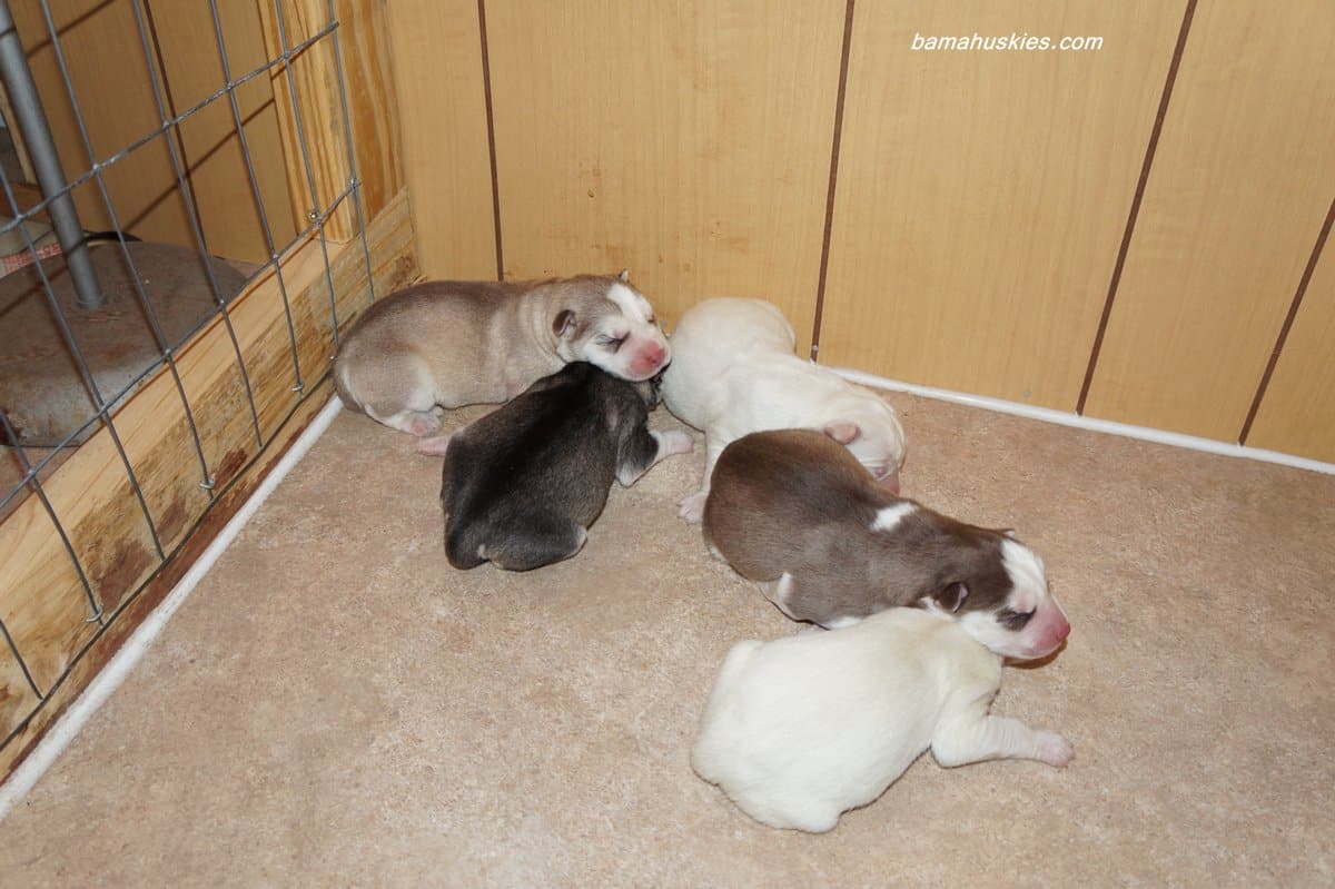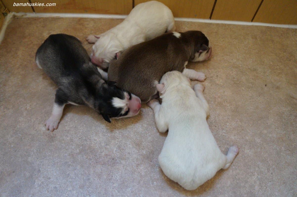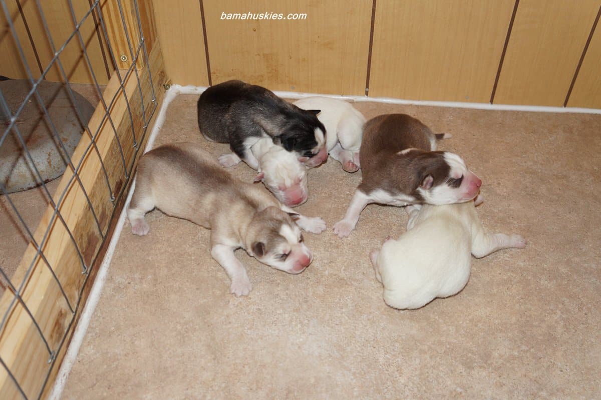 I know everyone has been excited about the birth of Amber’s husky puppies and we are too. Amber had 5 husky puppies yesterday February 26 which nobody will forget because we saw 9 inches of snow here in Alabama in the Northern part of the state. We will be adding pics on the sales page featured individually. I will assume all puppies are sold. I will have to go down my list starting with those on Amber’s list to see who wants what we have. Some customers may not have the sex and color they were hoping for and in that event they can wait until it comes up in a different litter.
