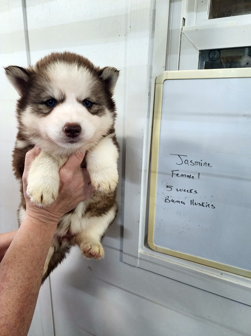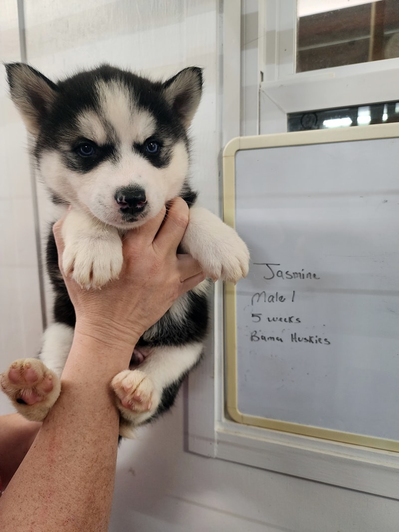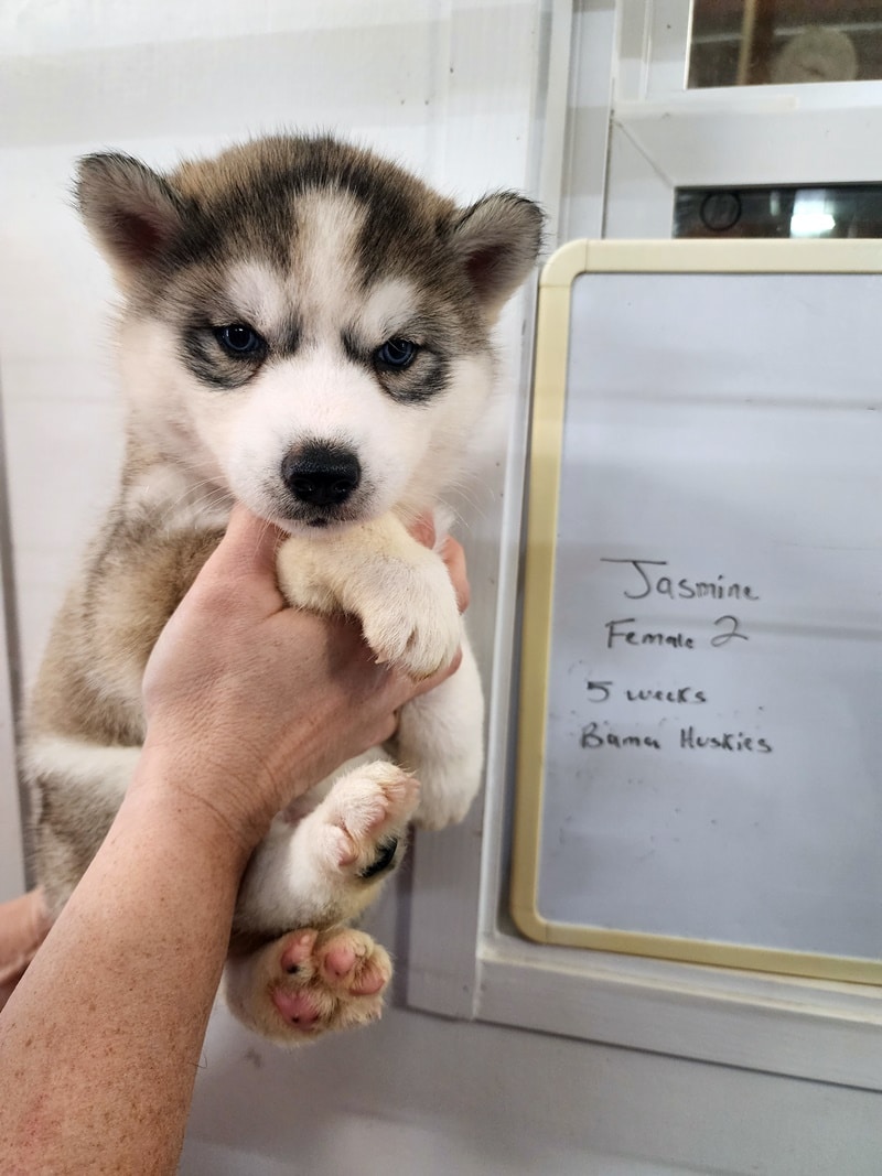 Jasmine’s puppies are big and sassy! They talk back on a regular basis now. These guys can start going home 2-12 thru 2-19. They will still have a final health check at the vet’s office at 6 weeks and be issued a health paper but we do not anticipate any issues. Please consider keeping them on the Nuvet vitamins for immune system booster and optimum health. Your puppy will be on Royal Canine puppy medium food. It’s a very expensive food. Bama Huskies provides the best for your new fur baby with no short cuts. Please make an appointment to pick up your puppy.