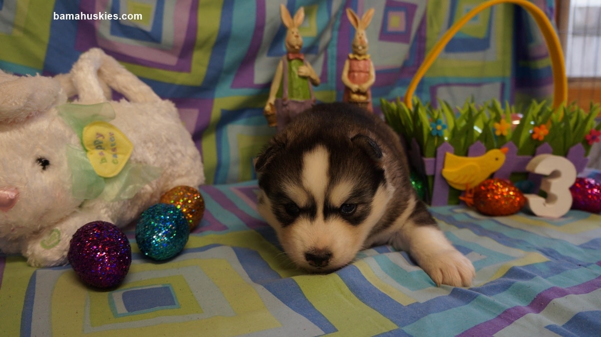 Luna’s husky puppies will be 4 weeks old tomorrow. We always do special things with any litter of puppies we have at the time of any special day so it was Easter Pictures today. These fur babies are growing fast and getting real active. I couldn’t imagine any other job than to take care and look after these precious husky puppies. Here are today’s pictures.