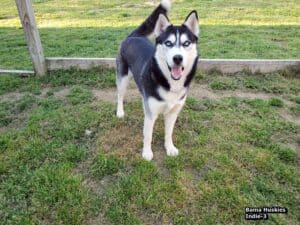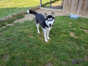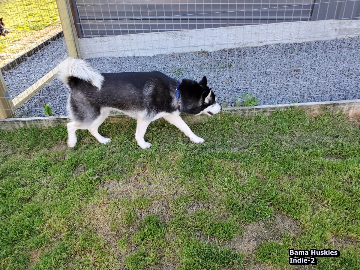 Meet Indie. Indie is a little over a year old female black and white husky with blue eyes. She did not come from Bama Huskies but is part of our bloodlines from a breeding. We actually have boarded her several times over the past year. She is very sweet, leash trained, healthy, and up to date on shots. She is on flea pills and heart wormer. Has a dose of each for next month. She is fixed and house broke and crate trained.