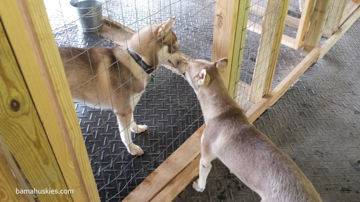 Aries a red and white husky meeting his mommy for the first time since he was a puppy.